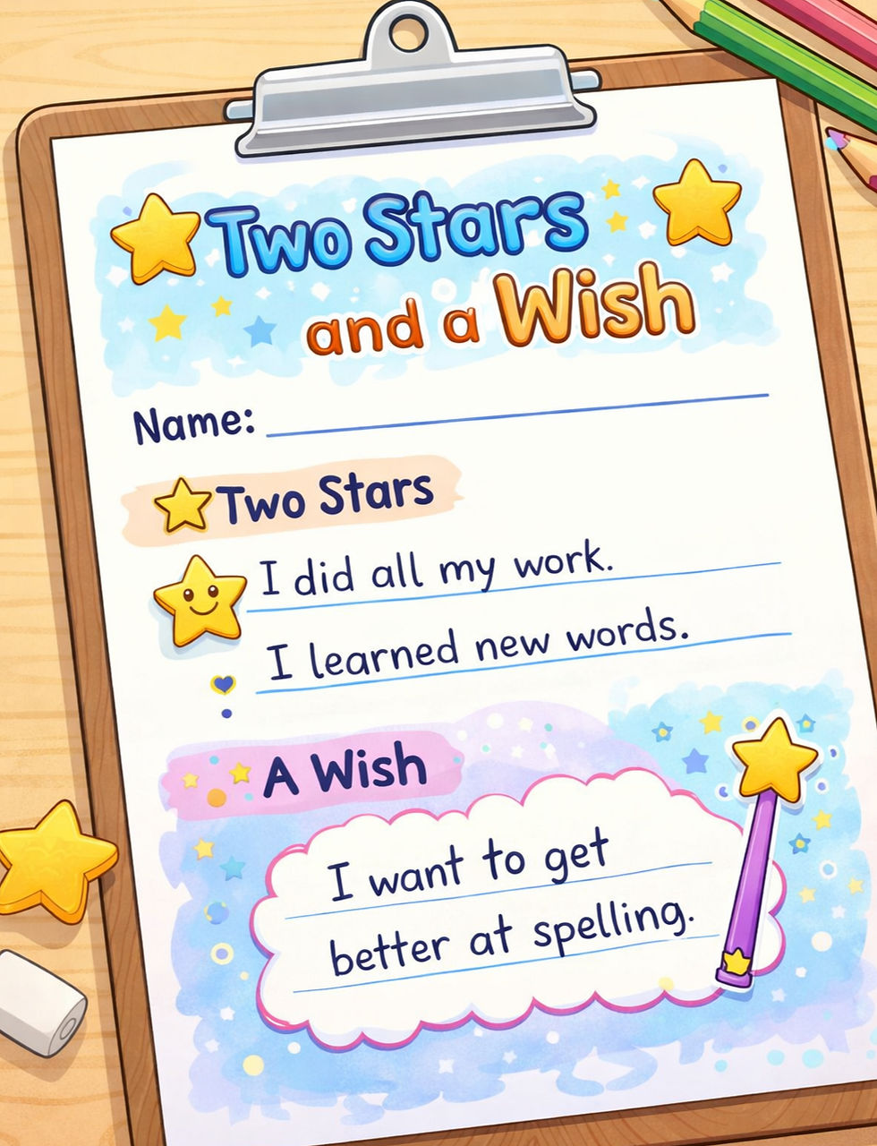 With younger learners, reflection can be playful: use colour-coded stickers, thumbs-up/thumbs-down, or 'draw-a-smiley-face' to let them indicate how confident they felt with the lesson. Take this one step further when finishing a unit of work or term and encourage little ones to complete a 'two stars and a wish' type self-assessment. These exercises help learners to notice their own learning, an essential step towards independence.